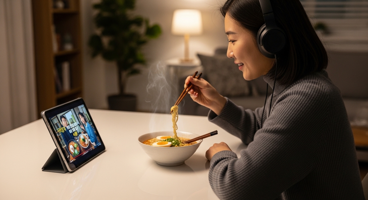 - ASMR 청취: 씹는 소리, 국물 소리 등이 담긴 ASMR을 들으면, 다른 사람이 옆에서 함께 먹는 듯한 느낌을 주어 심리적 안정감을 얻을 수 있습니다.