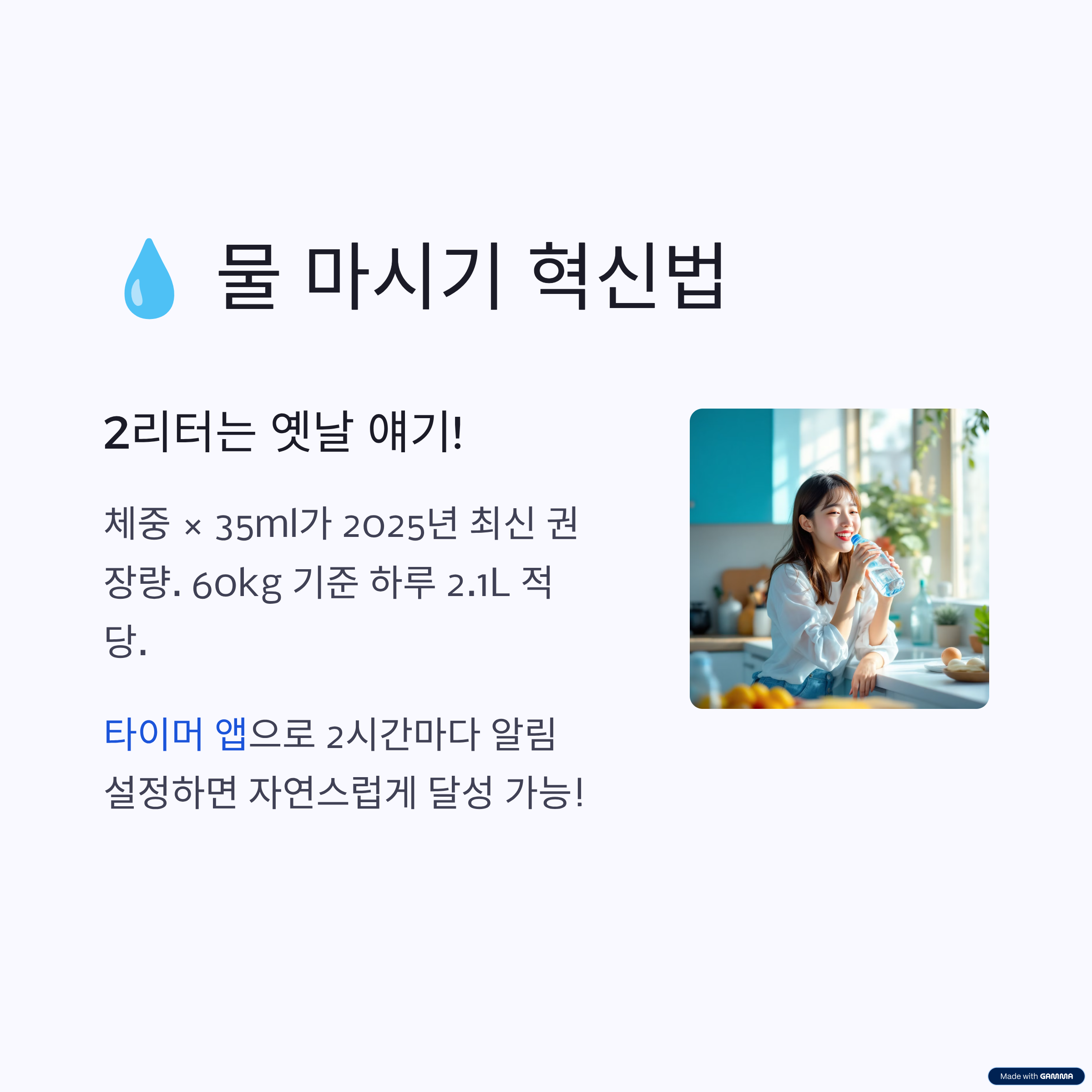 - 하루 2리터 수분 섭취: 체내 대사 활성화 및 피로 개선